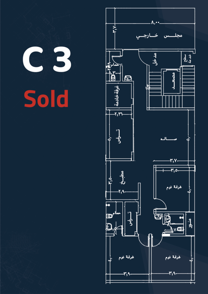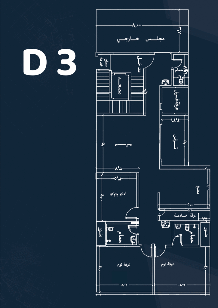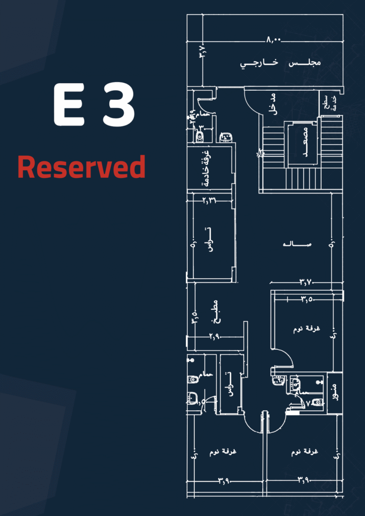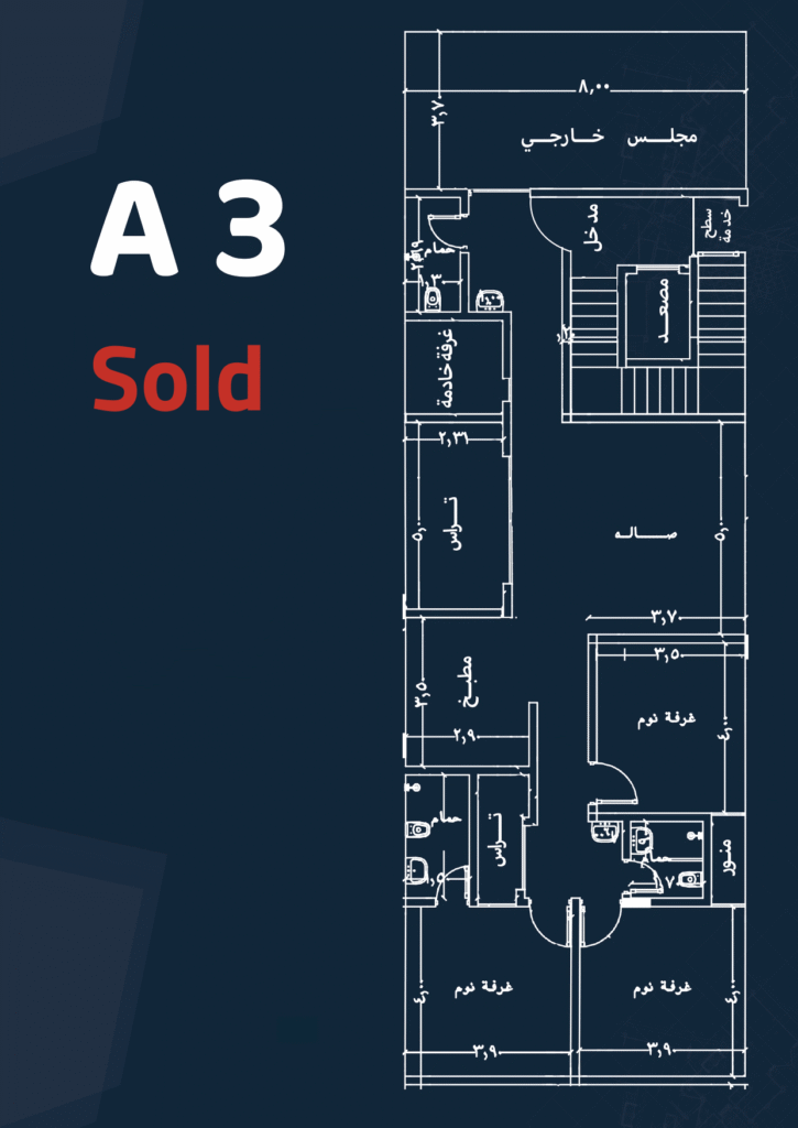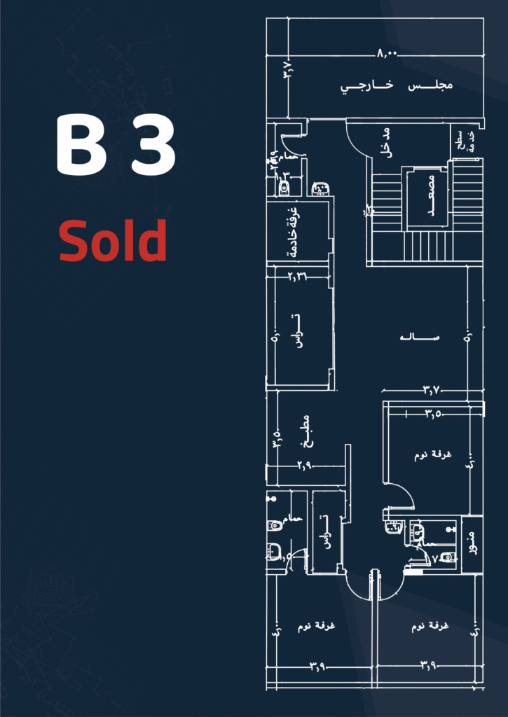 Specifications: Front façade – Side balcony – Maid’s and laundry room – 3 bedrooms – 4 bathrooms – Living room – Majlis – Private parking – Driver’s room – Kitchen.